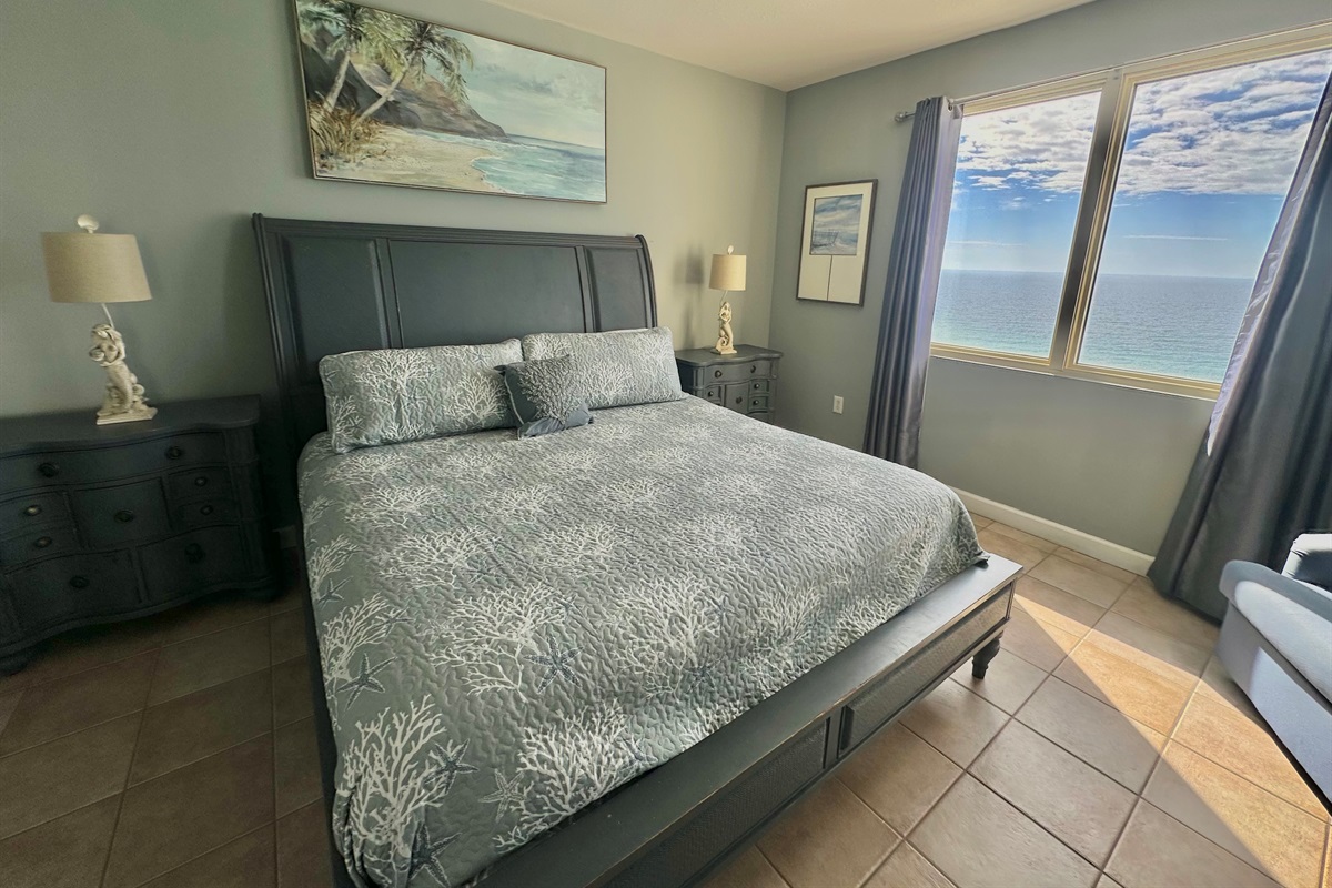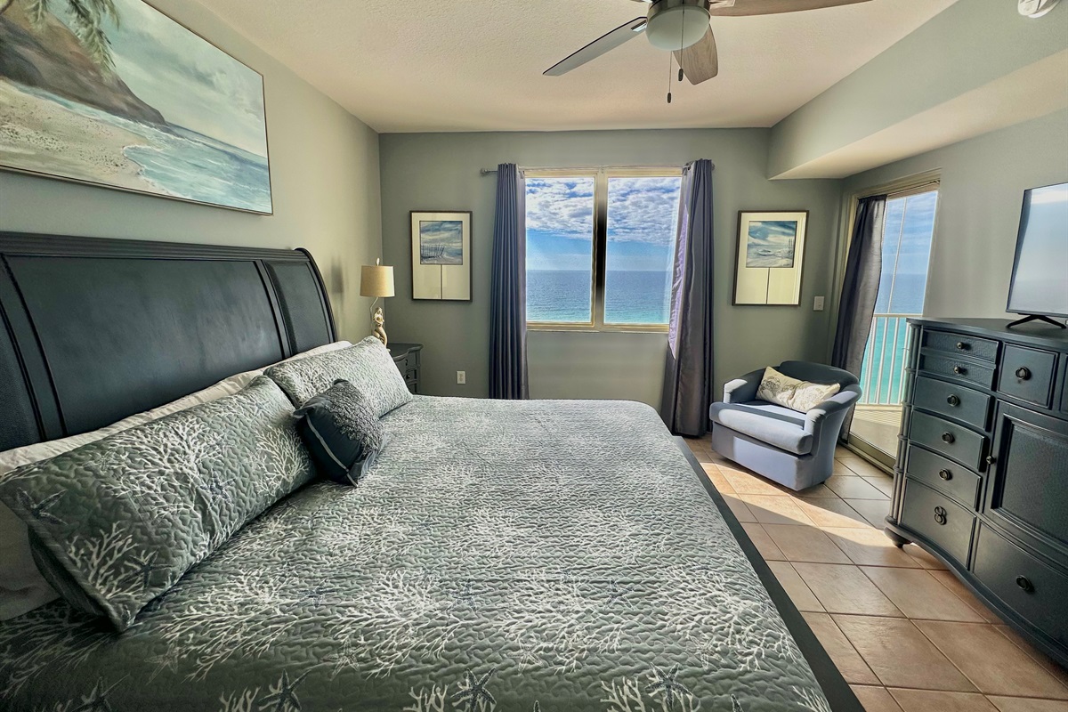 - Master Bedroom with a King Bed, Gulf views, flat-screen TV, and a private en-suite bathroom with a bathtub/shower combo.