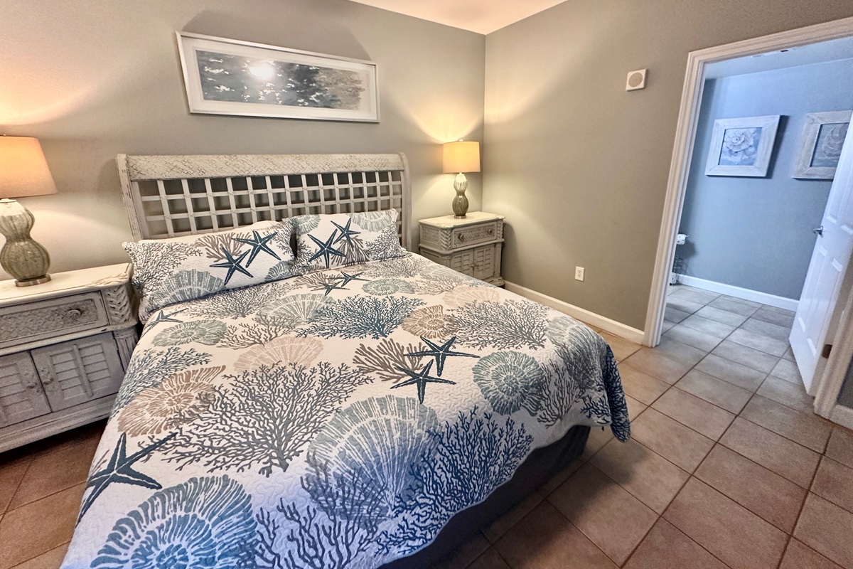 - Second Bedroom with a King Bed, flat-screen TV, and direct access to the second bathroom, also with a bathtub/shower combo.
