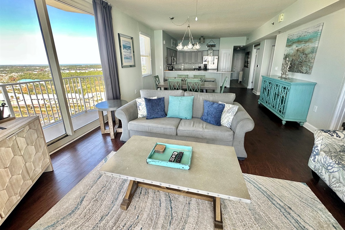 The condo features a bright, open living space with comfortable seating, a flat-screen TV, and direct balcony access so you can enjoy the view anytime.
